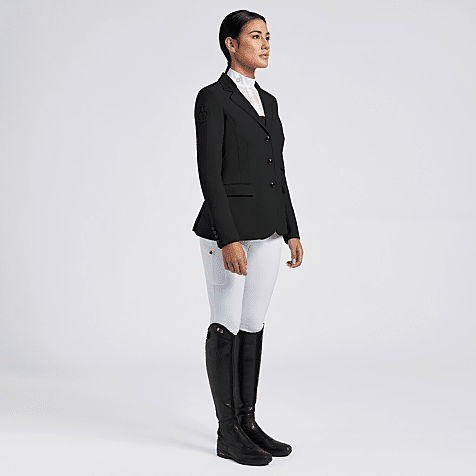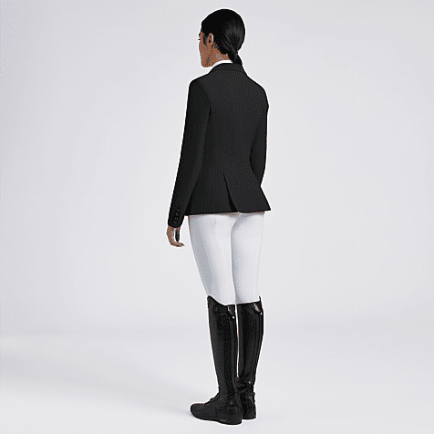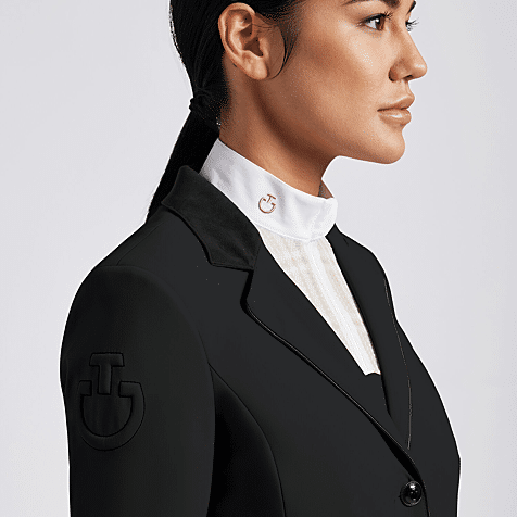 Die Jacke zeichnet sich durch ein klassisches und tailliertes Design aus, das durch einen Kragen und Alcantara-Paspeln in Kontrastfarbe verfeinert wird.